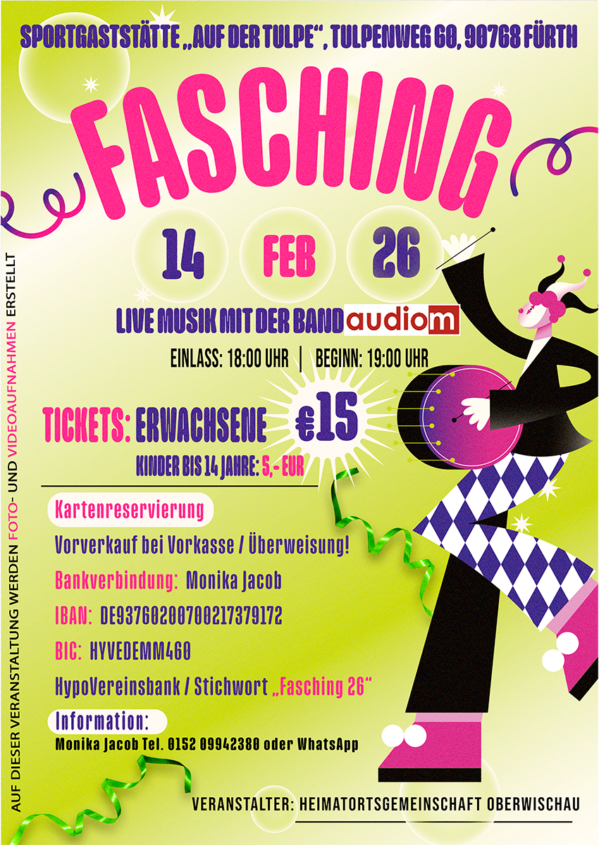 Die HOG-Oberwischau lädt auch dieses Jahr am 14.02.2026 zum Faschingsball in Fürth ein.